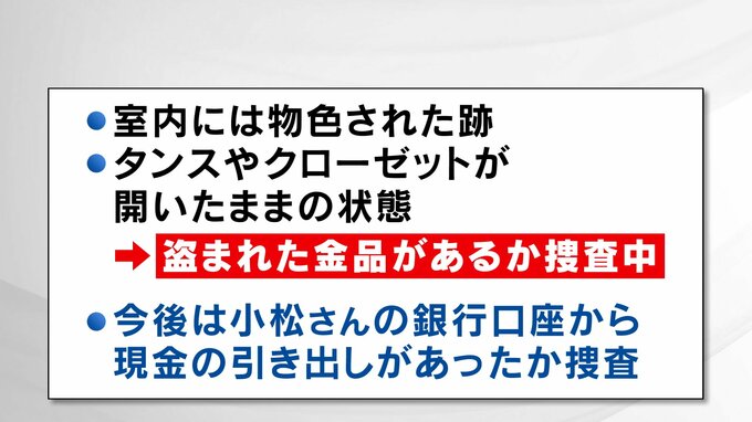 今後、捜査本部では、小松さんの銀行口座から現金の引き出しがあったかなども調べていくとしています。