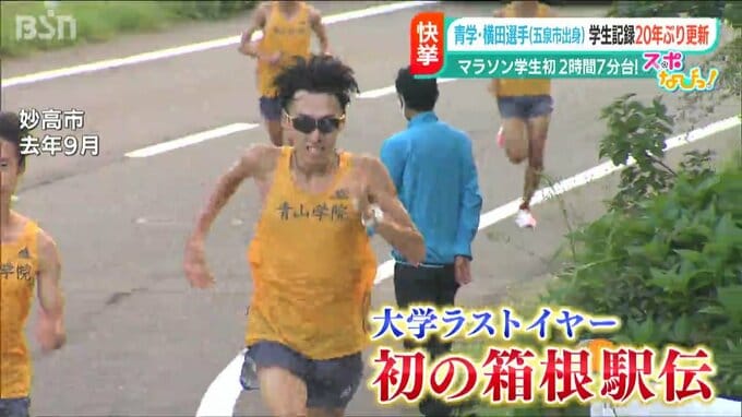 5日に大分県で開かれた大会で、五泉市出身の青山学院大学の4年生・横田俊吾選手が日本人2位に入り、学生初の2時間7分台で、20年ぶりに学生記録を更新しました。