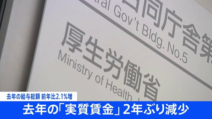 働く人1人あたりの去年の現金給与の総額は、前の年と比べて2.1%増え、1991年以来、31年ぶりの伸び幅となりました。一方、物価の変動を反映した実質賃金は2年ぶりの減少となりました。厚生労働省によりますと、基本…