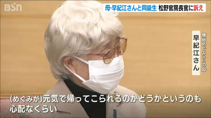 北朝鮮に拉致された横田めぐみさんの母・早紀江さんは、めぐみさんの同級生らと拉致問題担当大臣を兼任する松野博一(まつの・ひろかず)官房長官と6日に面会し、一刻も早い拉致問題の解決を訴えました。