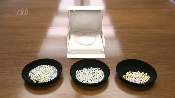 福岡県庁でお披露目されたのは、大珠と言われる直径8ミリほどのアコヤ貝の真珠です。この真珠は福岡県新宮町の相島で養殖されたもので、事業を手がける株式会社ミキモトの代表らが県庁を表敬訪問し、服部知事に今年の出来を報告しました。