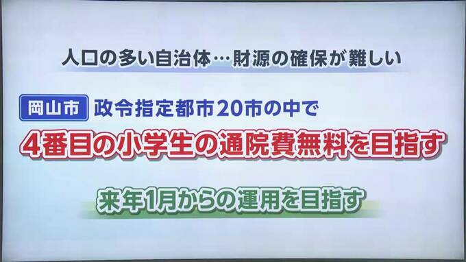 岡山市の拡充が遅れた背景には、人口の多い自治体では、財源の確保が難しいという側面がありました。今回、政令市としては全国で4番目となる小学生の通院費無料化を目指している岡山市。国政でも子育て支援とその負担が注目を浴びるなか、来年1月からの運用を目指しています。