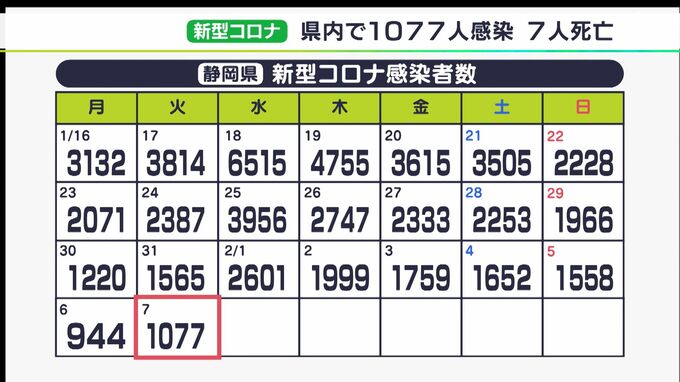 2月7日、静岡県内では1,077人が新型コロナウイルスに感染したことが分かりました。新たな感染者は、浜松市が116人、静岡市が166人、その他の市や町の合計が795人です。静岡県全体で7人の死亡が報告されています。1…