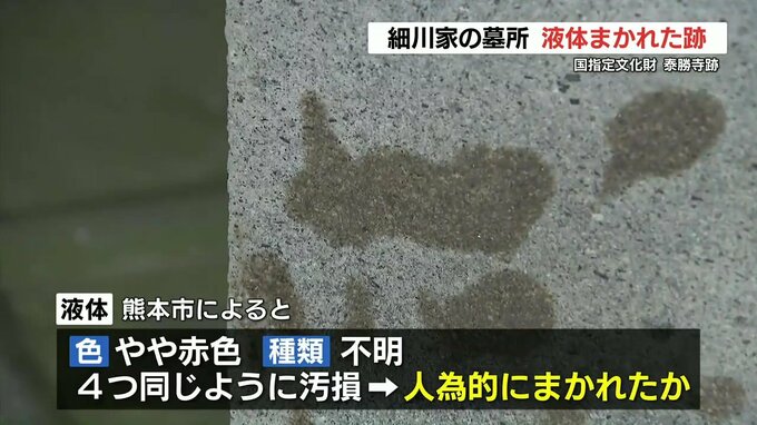 熊本市にある国指定文化財の「泰勝寺」跡で、2月2日、4つの御廟に液体がまかれたような跡が見つかり、熊本市は警察へ被害届を出す予定です。2月2日、熊本市中央区にある国指定文化財の細川家の墓所「泰勝寺」跡…