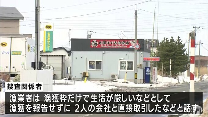 2人は2021年度だけで漁業者22人から98トンの漁獲を報告せずにマグロを買い上げていて、捜査関係者によりますと、漁業者は、自身にわりあてられた漁獲枠だけで生活することが厳しかったことなどから漁獲を報告せずに2人の会社と直接取引したなどと話しているということです。