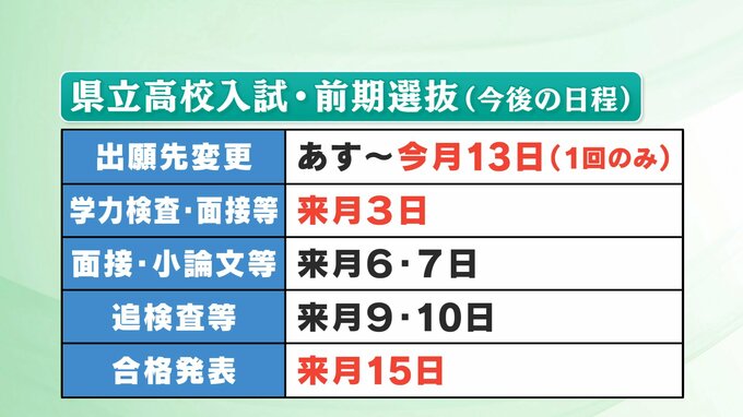また、新型コロナの感染などで、3日の学力検査を受験できなかった生徒の救済措置として、9日・10日に追検査が予定されています。そして、合格発表は15日です。