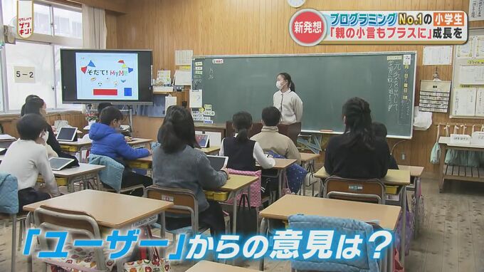 ゲームクリエーターの先生と専門用語でやり取りする、小学5年生の久保田千織(くぼた ちおり)さん、作っているのはキャラクター育成ゲームです。
