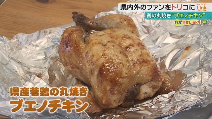 溢れんばかりのニンニクに、こんがりとした焼き色、県内外問わず多くのファンがこぞって買い求める人気商品が『県産若鶏の丸焼きブエノチキン』です。