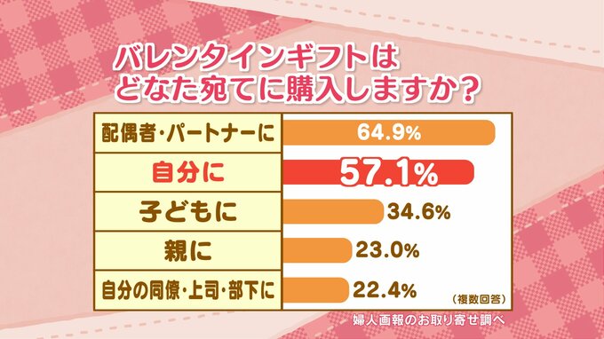 バレンタインギフトを誰に買いますか?というアンケートを見ると、「自分に」という方が半数以上に上っています。自分へのご褒美という方も多いんですね。