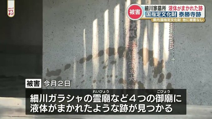 熊本市にある国指定文化財の「泰勝寺(たいしょうじ)」跡で今月2日、4つの「御廟(ごびょう)」に液体がまかれたような跡が見つかり、熊本市は警察へ被害届を出す予定です。赤っぽい色で汚された石の土台。液体を…