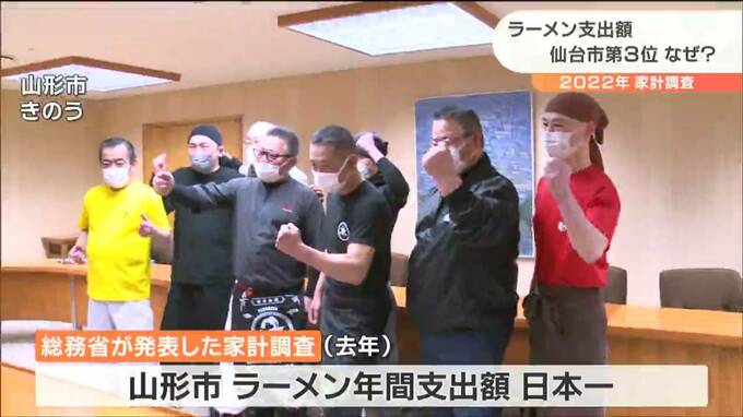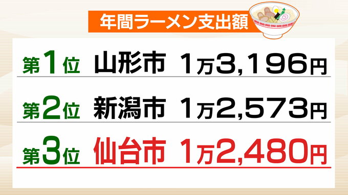 総務省が発表した去年の家計調査で外食の中華そば=ラーメンの年間支出額が発表されました。それによりますと全国1位が山形市、2位が新潟市それに次ぐ3位が仙台市となりました。 3位という結果に市内のラーメン店からは喜びの声が聞かれるなか、なぜ支出額が増えたのか?その要因について取材しました。