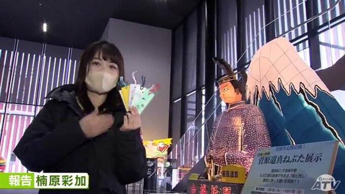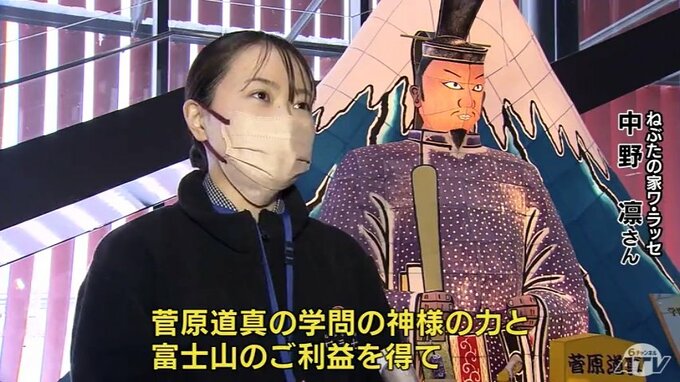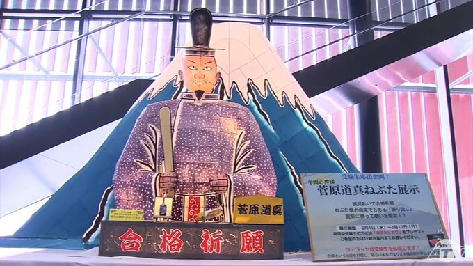 縦1メートル60センチ横1メートル10センチの菅原道真のねぶた。受験生を応援しようと毎年、この時期青森市の「ねぶたの家ワ・ラッセ」に展示されています。今年は初めて富士山のねぶたも展示され、合格という頂上にたどり着きますようにと、道真とともに受験生たちを見守っています。