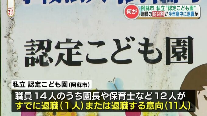 阿蘇市の「認定こども園」で職員のおよそ9割が今年度中に退職する意向を示していることが分かりました。一体、何が起きているのでしょうか。職員のほとんどが退職するのは阿蘇市の私立「認定こども園」で、職員14…