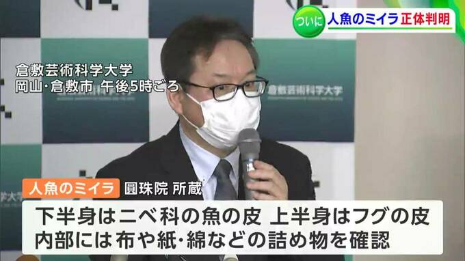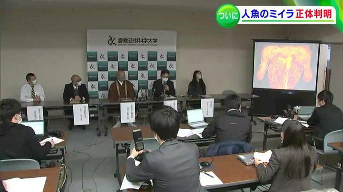 倉敷市の倉敷芸術科学大学で、7日午後「人魚のミイラ」研究プロジェクトチームの最終報告会見が開かれました。生物学だけでなく民俗学的な調査の結果も報告されました。