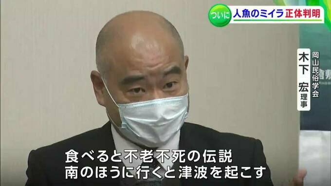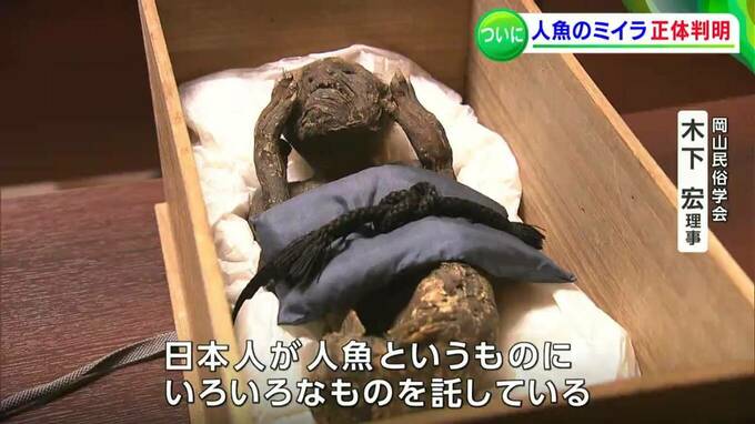 (岡山民俗学会 木下宏理事)「食べると不老不死の伝説。南の方に行くと津波を起こす。日本人が人魚というものに色々なものを託している。(人魚のミイラは)それの一つのあらわれ。ですから今でも大切に保存されて、パッと見るとこれは人魚だとみなさん分かる」