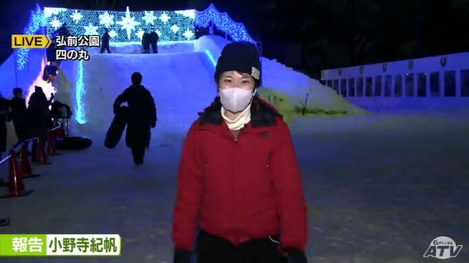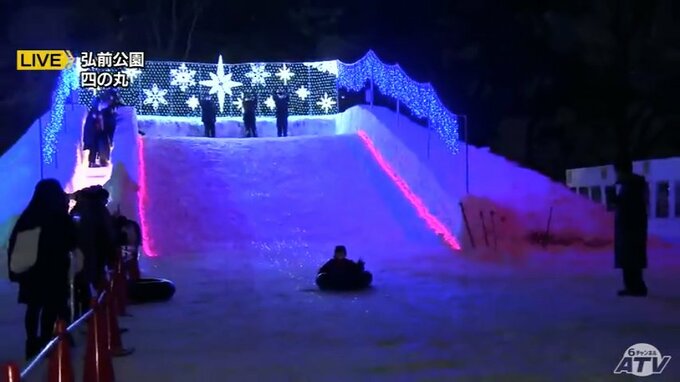 弘前城雪燈籠まつりメイン会場となる弘前公園四の丸(しのまる)には、子供たちに大人気の大型滑り台も例年通り完成しました。初日の9日夕方は、2年ぶりの雪灯篭まつりを楽しむのにはぴったりの風もなく穏やかな天気となり、会場には多くの家族連れが訪れています。