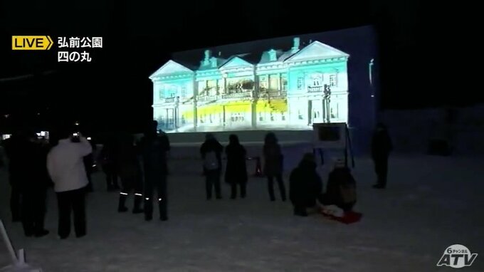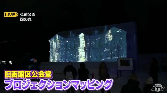 大雪像の今年の題材は国の重要文化財・「旧函館区公会堂」で気品漂う華やかな雰囲気が再現されています。その大雪像で楽しむプロジェクションマッピングは迫力満点、まつり最終日まで毎日午後6時から行われます。