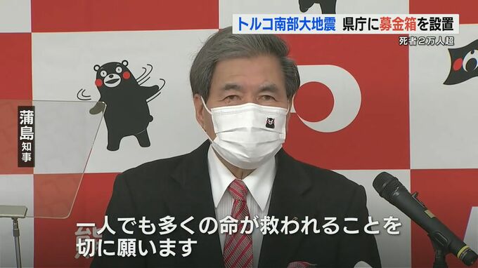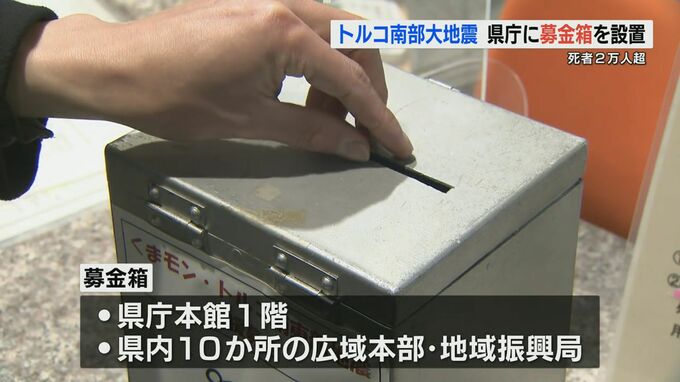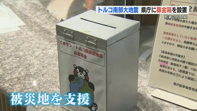 トルコ南部で発生した地震で大きな被害が出ている被災地を支援するため、熊本県庁に募金箱が設置されました。