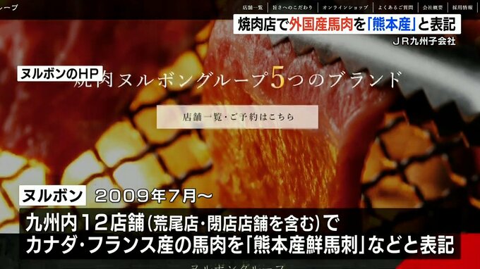 福岡市に本社を置く焼肉店・ヌルボンによりますと、荒尾市の店舗などすでに閉店した店舗を含め九州内の12店で、2009年7月からカナダ産やフランス産の馬肉を「熊本産鮮馬刺」などと表記して提供していたということです。