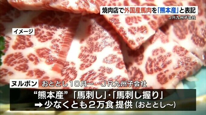 ヌルボンは、おととし2021年10月に事業継承し、現在はJR九州の子会社で、これまでに熊本産と表記して提供した「馬刺し」と「馬刺し握り」は、少なくとも2万食だということです。