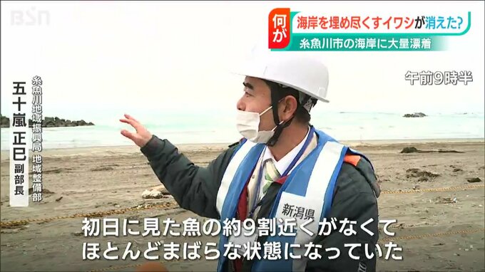 新潟県糸魚川市の海岸に漂着した大量のイワシが、現場の海岸から一時、一斉に消えていました。