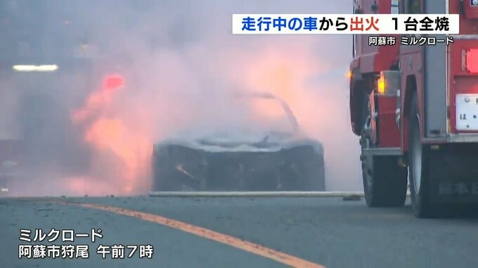 12日朝、阿蘇市の県道で走行中の車から火が出て全焼しました。けが人はいないということです。12日午前6時ごろ阿蘇市狩尾(かりお)の県道、通称ミルクロードで走行していた乗用車から火が出ました。火はおよそ1時…