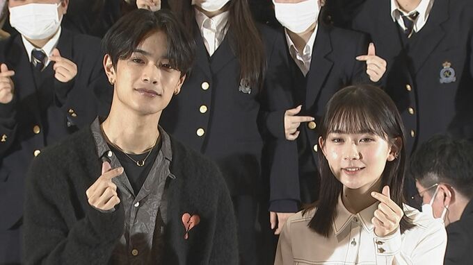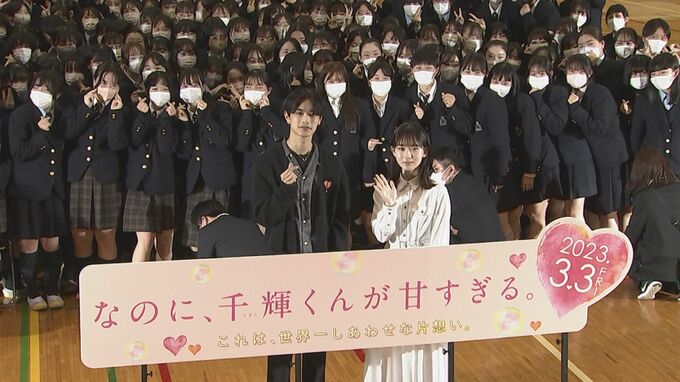 映画「なのに、千輝くんが甘すぎる。」の公開直前バレンタインイベントが、都内の女子高で行われ、なにわ男子の高橋恭平さん、畑芽育さんが参加しました。