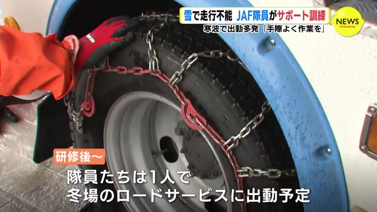 JAFは、雪で車を動かせなくなったときに、安全に引きだしたり、布製チェーンを装着したりするサービスを提供しています。13日は、サービスに出動する際に必要な冬用チェーンをタイヤに巻く訓練などが行われました。