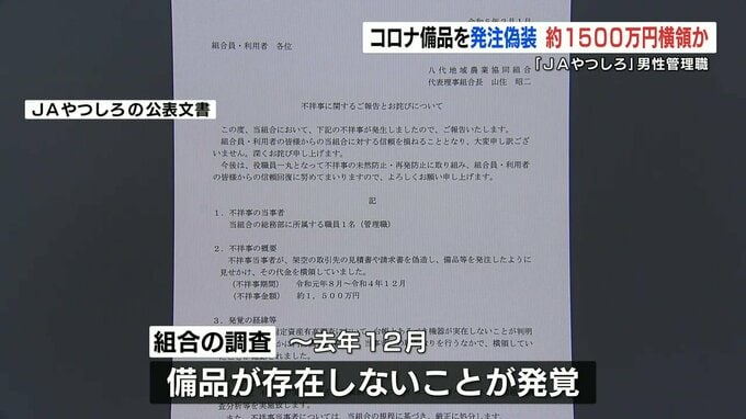 熊本県の「JAやつしろ」は、管理職の男性職員が架空の備品を発注したようにみせかけて、組合の金およそ1500万円を横領していたことを明らかにしました。