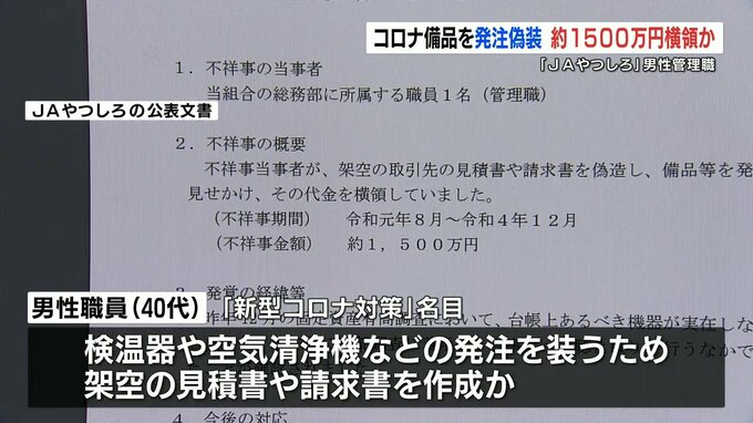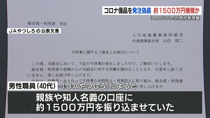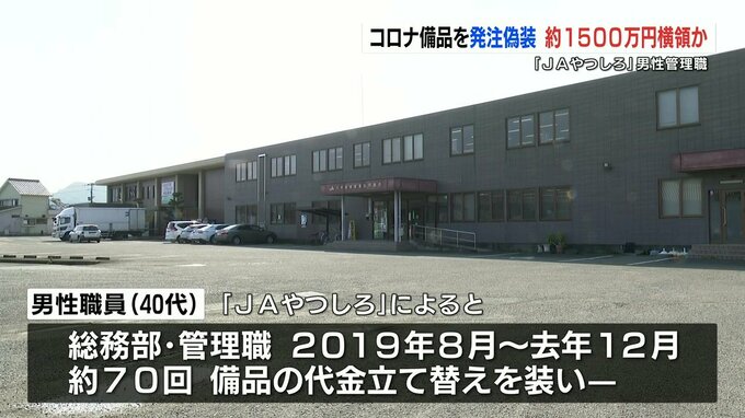 「JAやつしろ」によりますと、総務部で管理職を務める男性職員(40代)は、2019年8月から2022年12月にかけて、約70回 備品の代金を立て替えしたように装い、親族や知人名義の口座におよそ1500万円を振りこませていたということです。