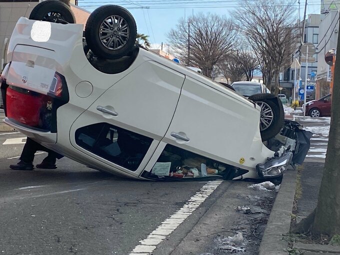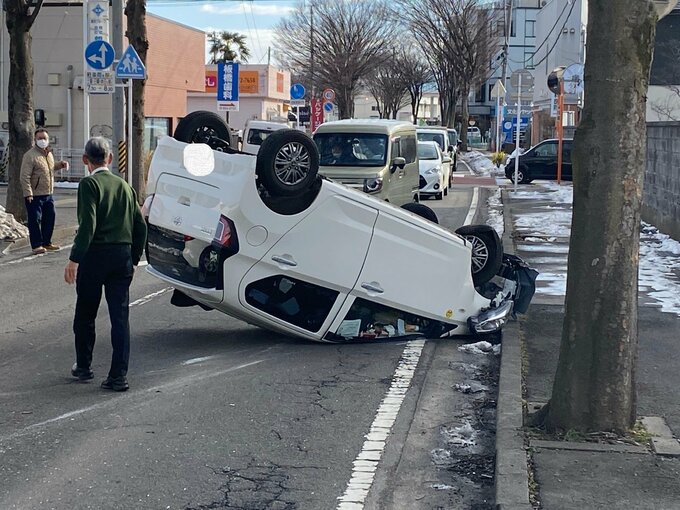 事故があったのは、福島市丸子の市道・通称「福商通り」で、警察などによりますと、14日午前8時半ごろ、走行中の乗用車が縁石に乗り上げ、そのまま横転しました。