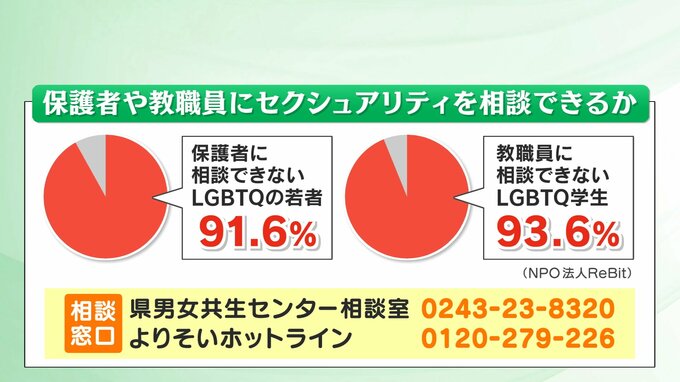 一方で、LGBTQの若者の9割以上が保護者にも教職員にもセクシュアリティについて安心して話せないと回答しています。