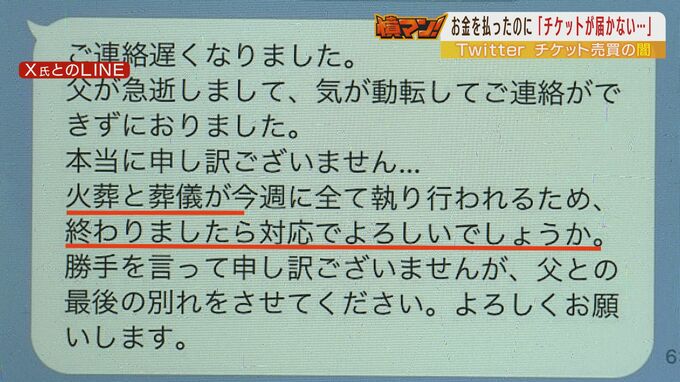 被害者Bさん:チケット届かず…言い訳は『父が急逝して気が動転…』