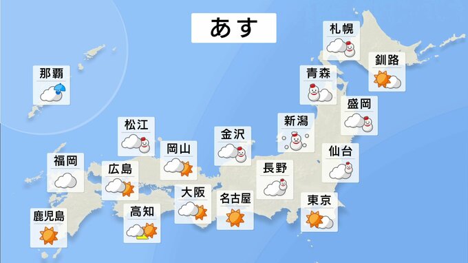 気温や雨の情報など、2月14日このあとの天気をお伝えします。あすもきょうと同じようなお天気が続きそうです。日本海側では雪なんですが、一方で、太平洋側では晴れる所が多くなりそうです。そして、あすのポイン…