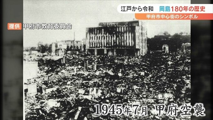 甲府空襲の焼け野原の中、何とか外観を留めているのが岡島です。その後いち早く改修工事を進め、営業を再開しました。