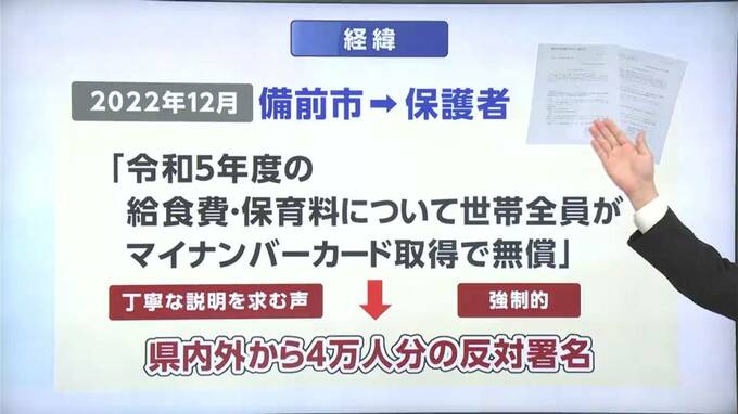 保護者らからも好評だった取り組みですが、去年12月、備前市の教育委員会は「全員がマイナンバーカードを取得した世帯に限る」と通達。これに対して「義務ではないカードの取得を半強制的に促されている」などと、反対署名が約4万人分集まる事態に発展しています。