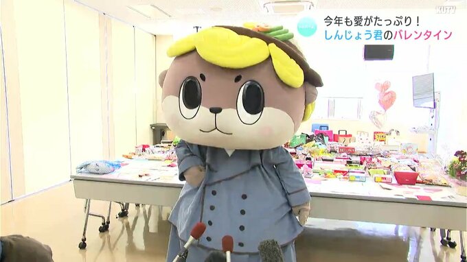 高知県須崎市のマスコットキャラクターしんじょう君のもとには今年も全国からたくさんのバレンタインプレゼントが届きました。机一杯に並べられているのは、今年しんじょう君に届いたバレンタインデーのプレゼント…