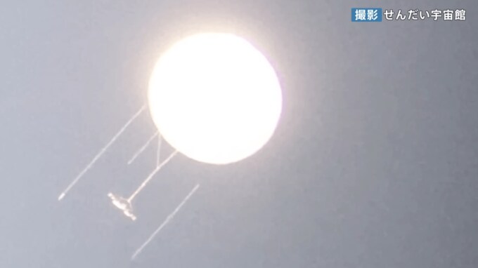 天体望遠鏡で撮影された写真を見ると複数の棒状のものがあり、中央には機材のようなものが吊り下げられています。気球が光って見えるのは、太陽の光を反射しているからだといいます。