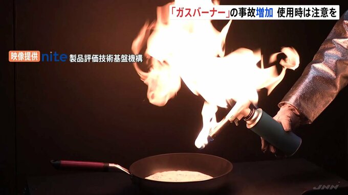 炙り料理などに使う手持ちの「ガスバーナー」による事故が増加しているとして、NITE=製品評価技術基盤機構が注意を呼びかけました。ガスバーナーに着火すると・・・本体から突然、激しい火が。NITEによりますと、…