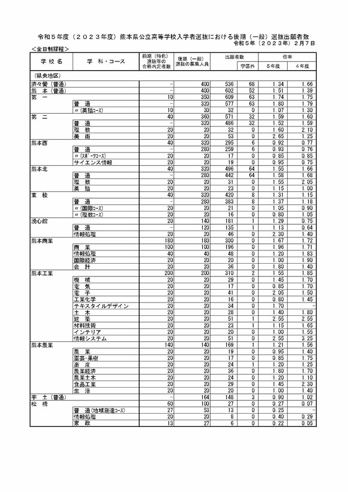 【熊本県公立高校入試】 2023年 出願倍率・出願者数一覧 全日制平均倍率は「0.95倍」 合格者発表は3月6日 熊本放送 2023年2月15日(水) 13:11 国内 令和5年度(2023年度)熊本県公立高等学校入学者選抜後期(一般)選抜における出願者数について 後期(一般)選抜試験は、2月21日(火)・22日(水)。合格発表は3月6日(月)に行われます。 *各校の出願倍率・出願者数は写真をご覧ください