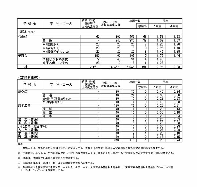 【熊本県公立高校入試】 2023年 出願倍率・出願者数一覧 全日制平均倍率は「0.95倍」 合格者発表は3月6日 熊本放送 2023年2月15日(水) 13:11 国内 2023年2月7日 熊本県教育委員会 発表
