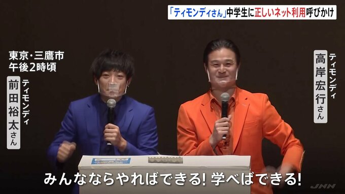 中学生にインターネットの安全な使い方を身につけてもらおうと、人気お笑いコンビ「ティモンディ」がイベントに登場しました。ティモンディ 前田裕太さん・高岸宏行さん「みんなならやればできる!学べばできる」…