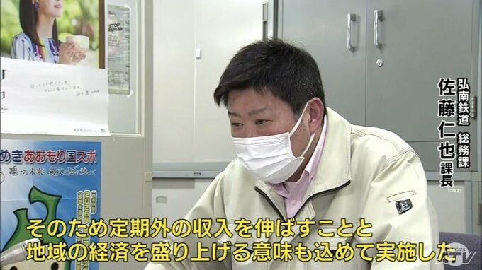 ※弘南鉄道総務課 佐藤仁也総務課長「コロナ禍で定期の収入が落ちてきた。そのため定期外の収入を伸ばすことと、地域の経済を盛り上げる意味も込めて実施した」