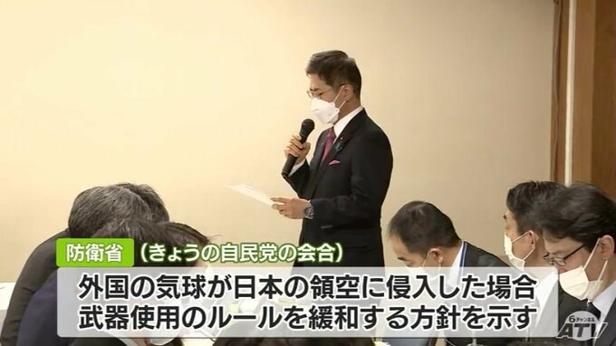防衛省は、15日に開かれた自民党の会合で、外国の気球が日本の領空に侵入した場合、武器使用のルールを緩和する方針を示しています。