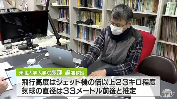 東北大学で天文学を研究する服部誠准教授は、宮城県内の複数の目撃情報を分析し、飛んでいた高さは、ジェット機の倍以上となる23キロ程度、気球の直径は33メートル前後と推定しました。