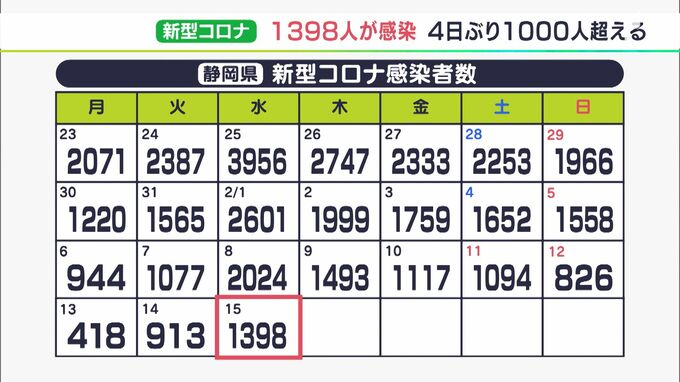 静岡県内では2月15日、新たに1,398人が新型コロナウイルスに感染したことが分かりました。感染者を地域別にみますと、浜松市で358人、静岡市で291人、そのほかの市と町で749人となっています。静岡県全体で5人の死…