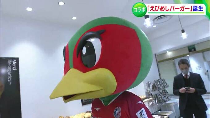 きょう(16日)は、ファジアーノ岡山の北川社長とファジ丸も駆け付けました。シーズン開幕から終了まで、土日限定で販売されるえびめしバーガーを食べて試合を盛り上げて欲しいと話します。