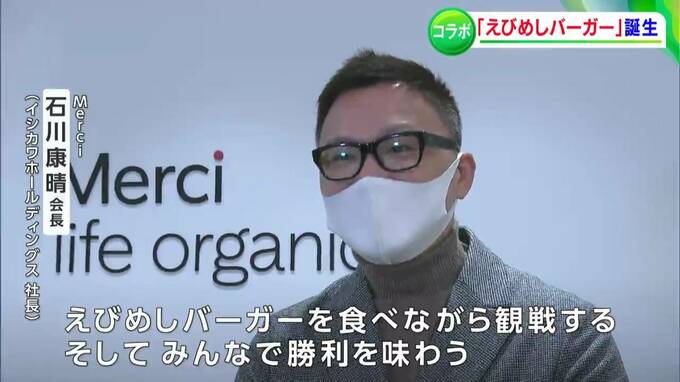 (Merci life organics 石川康晴会長)「えびめしバーガーを食べながら観戦する。そしてみんなで勝利を味わう。これをメルシーが少しでも貢献していけたらと思います」