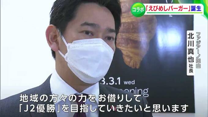 (ファジアーノ岡山 北川真也社長)「試合前にここに寄って、えびめしバーガーを買ってスタジアムに来ていただく。地域の方々の力をお借りして、“J2優勝”目指していきたいと思います」
