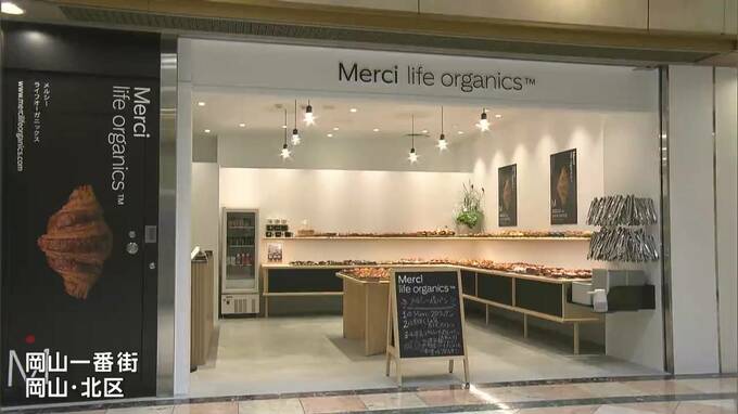 岡山市北区の岡山一番街にオープンする「Merci life organics 岡山一番街店」です。岡山市に本社を置くイシカワホールディングスのグループ会社が手がけたもので、店内には客からの人気が特に高い約35種類のパンが並びます。